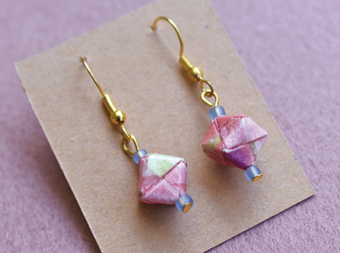 折り紙を使用し、パーツを組み合わせ コーティングしたピアスやイヤリングを 作っています。細かい手作業品なので、 全て一点物です。浴衣や着物に是非!