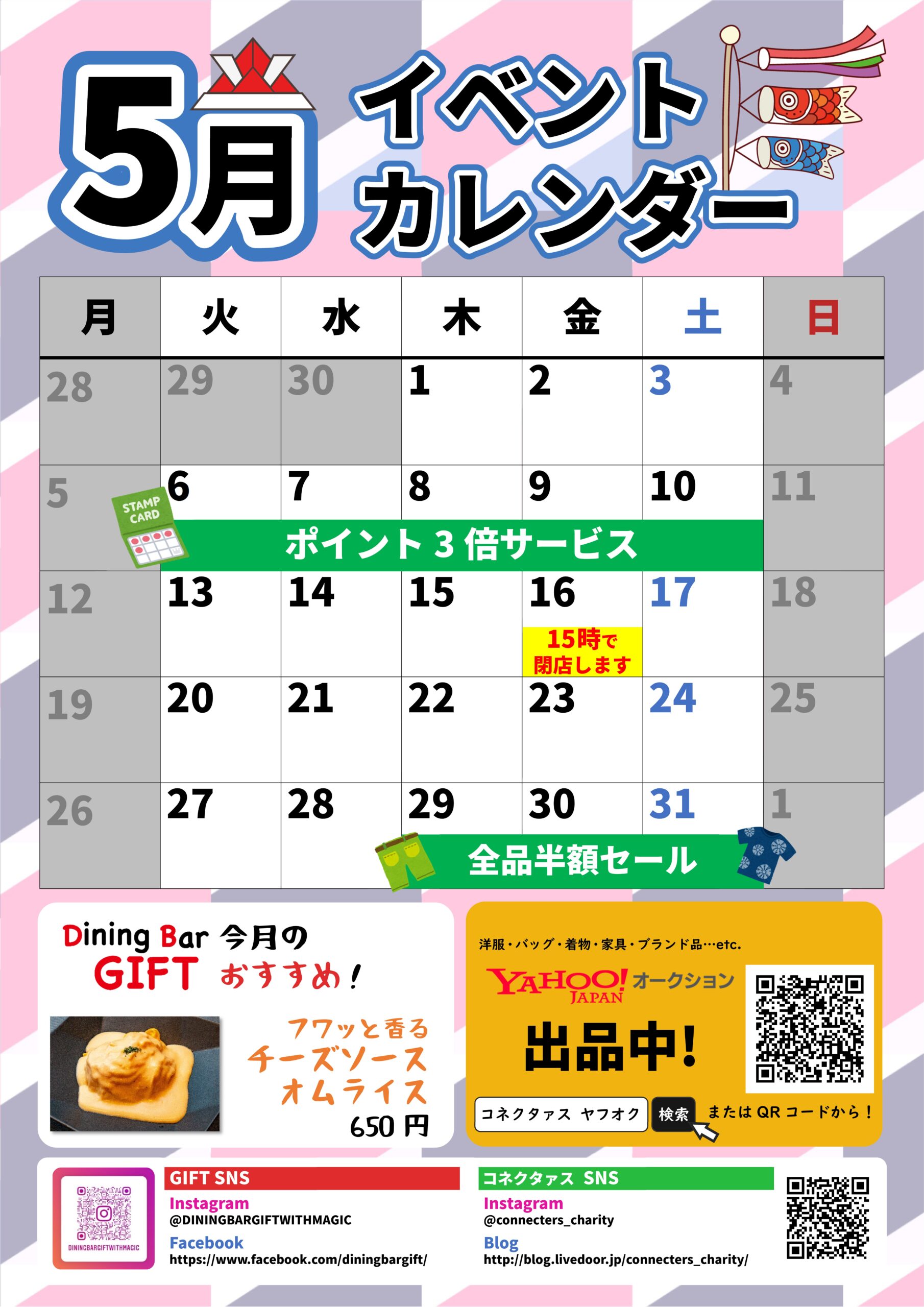 5月の営業予定(16日は時短です)